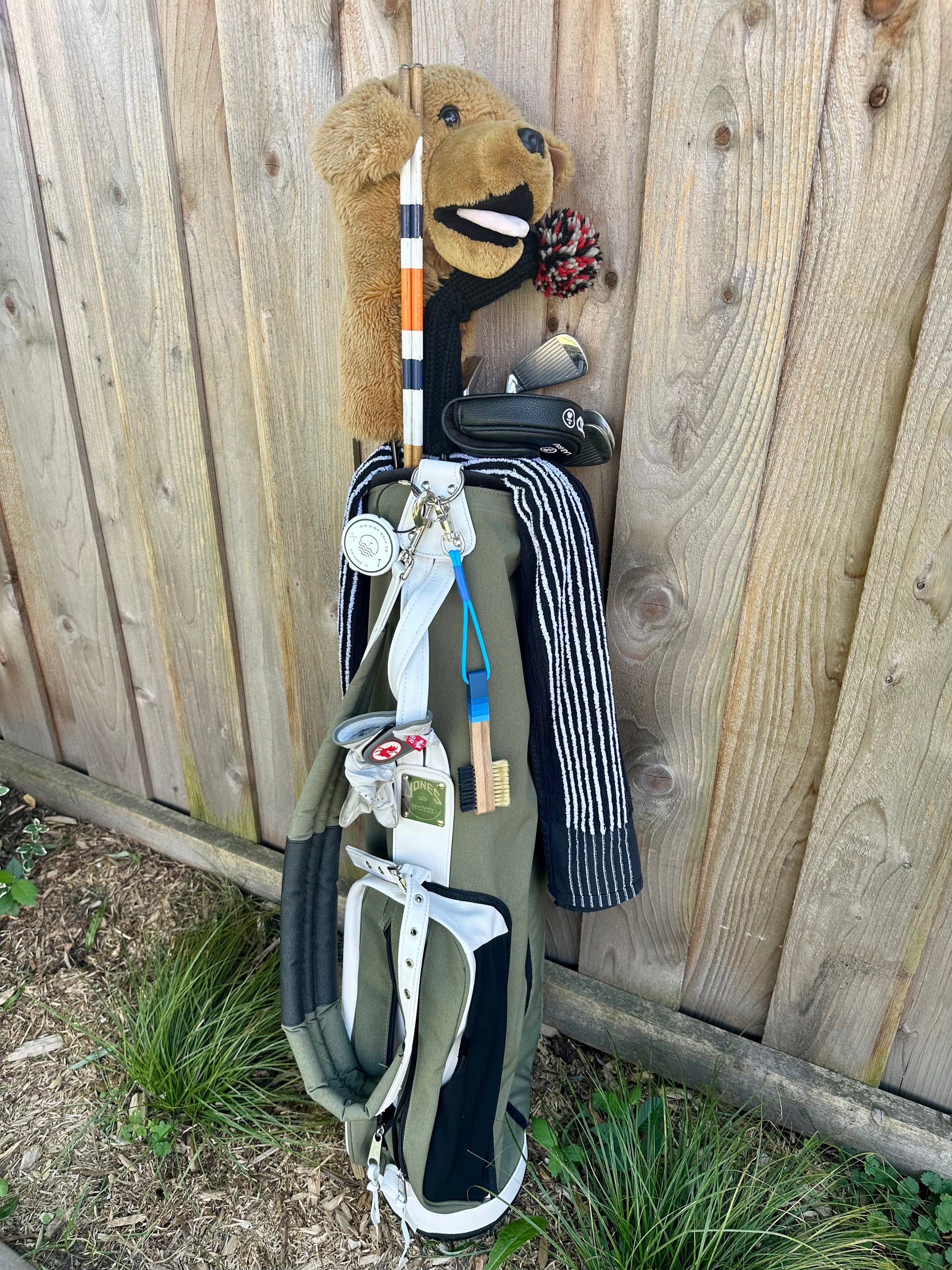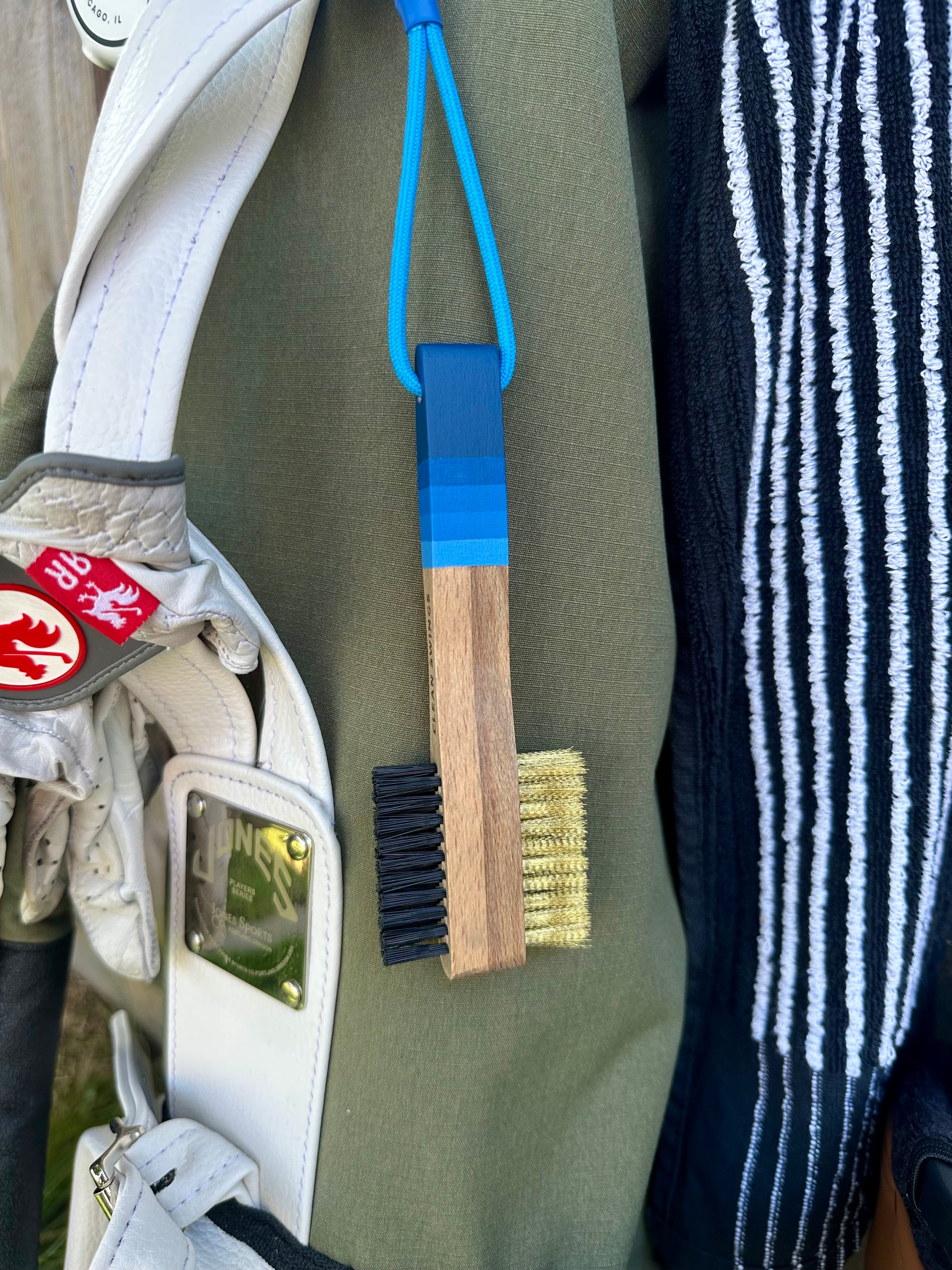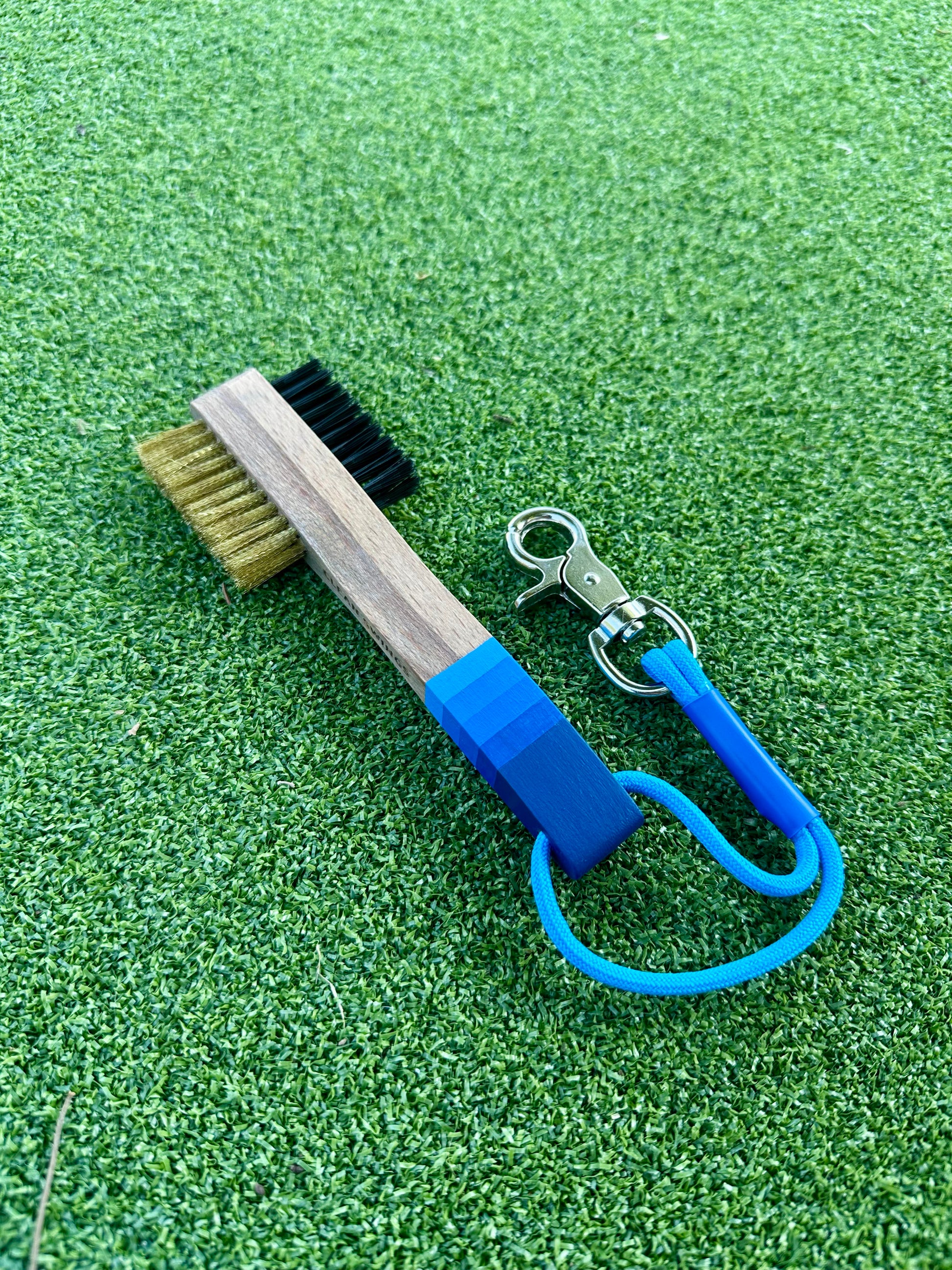 Featuring a gray wood stain with bold blue accents and a matching cord, this brush brings a fade to your game even if you can’t hit one off the tee. Handcrafted with dual bristles, it’s built for golfers who want a stylish bag and clean grooves.